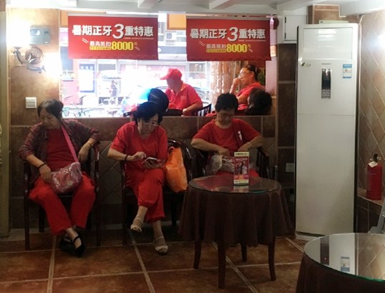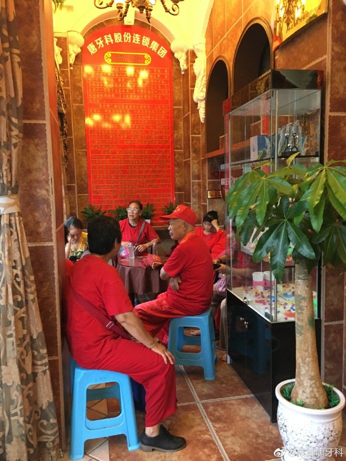 7月9日,从早上九点过大雨就一直未停,一群身着红衣的大爷大妈进入唐牙科琉璃门诊避雨。据说是附近腰鼓队的,旁边刚好有店要开业,结果偶遇大雨无法正常工作,只好到唐牙科避雨。