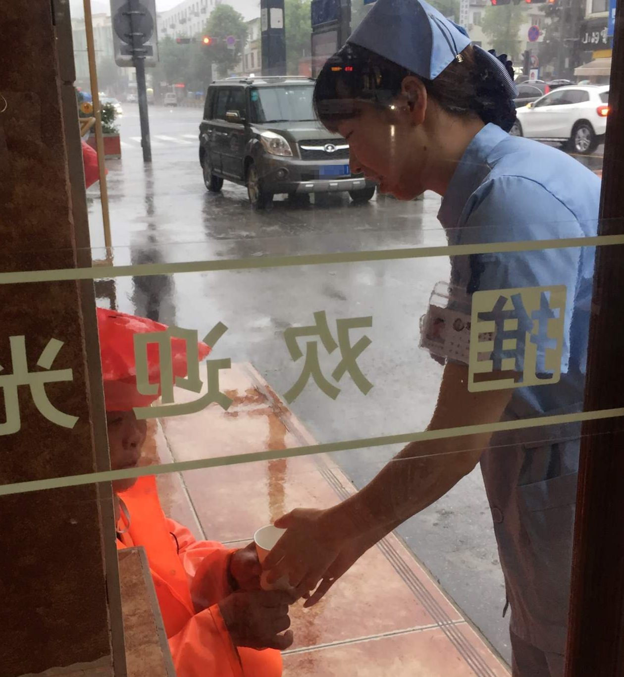 当清洁工阿姨站在华阳门诊屋檐下时,我们可爱的护士妹妹立马邀请阿姨进屋避雨,但被阿姨拒绝了,说怕巡查人员看不到她。无奈下,护士妹妹只好带杯热水为阿姨取走寒意。
